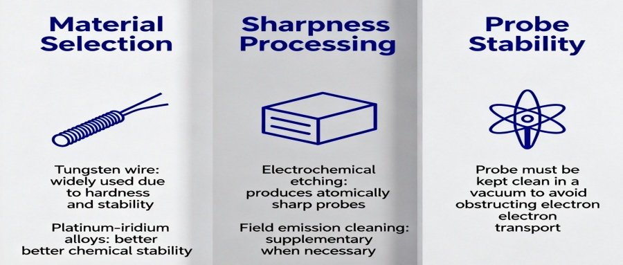 Sharpness Processing: Electrochemical etching can produce atomically sharp probes, supplemented by field emission cleaning when necessary.