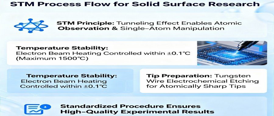 With the development of nanoscience, STM has become an important tool for studying the structure and electronic properties of solid surfaces. Its unique tunneling effect allows researchers to directly observe atomic arrangements and perform single-atom manipulation. To obtain high-quality experimental results, the STM process flow must strictly follow standardized procedures.