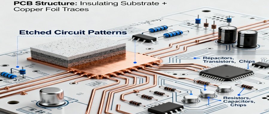 - A PCB consists of an insulating substrate and copper foil traces.
