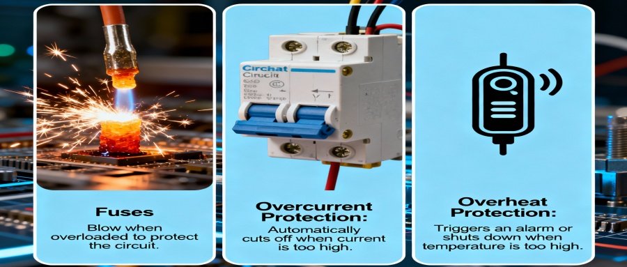 - Fuses: Blow when overloaded to protect the circuit.