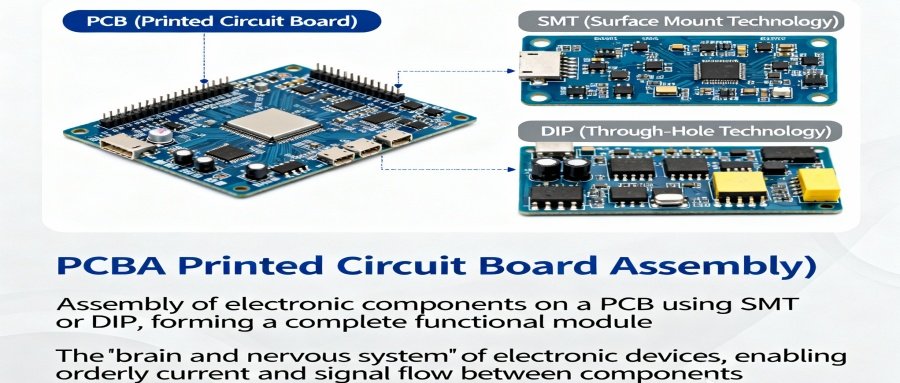 A PCBA (Printed Circuit Board Assembly) refers to the assembly of electronic components on a PCB (Printed Circuit Board) using surface mount technology (SMT) or through-hole technology (DIP), forming a complete functional module. It is the “brain and nervous system” of electronic devices, allowing current and signals to flow orderly between components.