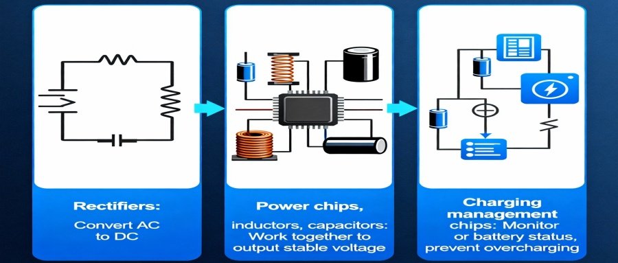 - Power chips, inductors, and capacitors work together to output a stable voltage.