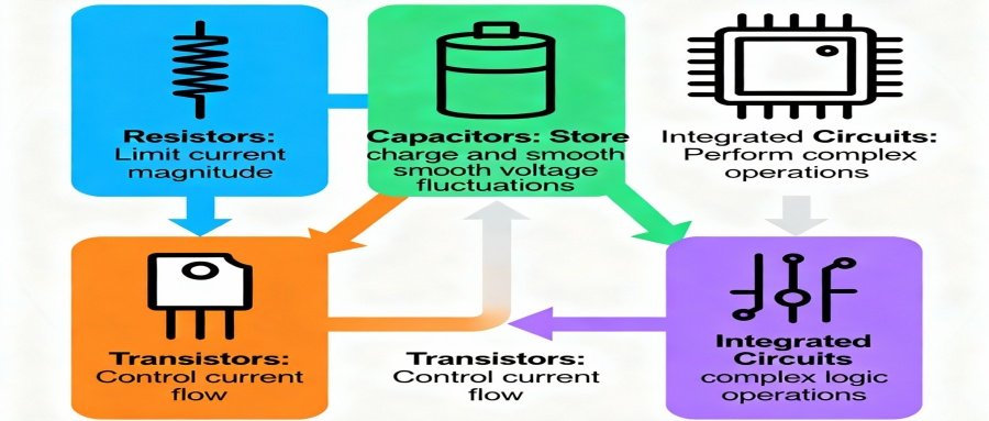 - Transistors: Control current flow