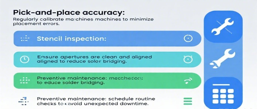 - Pick-and-place accuracy: Regularly calibrate machines to minimize placement errors.